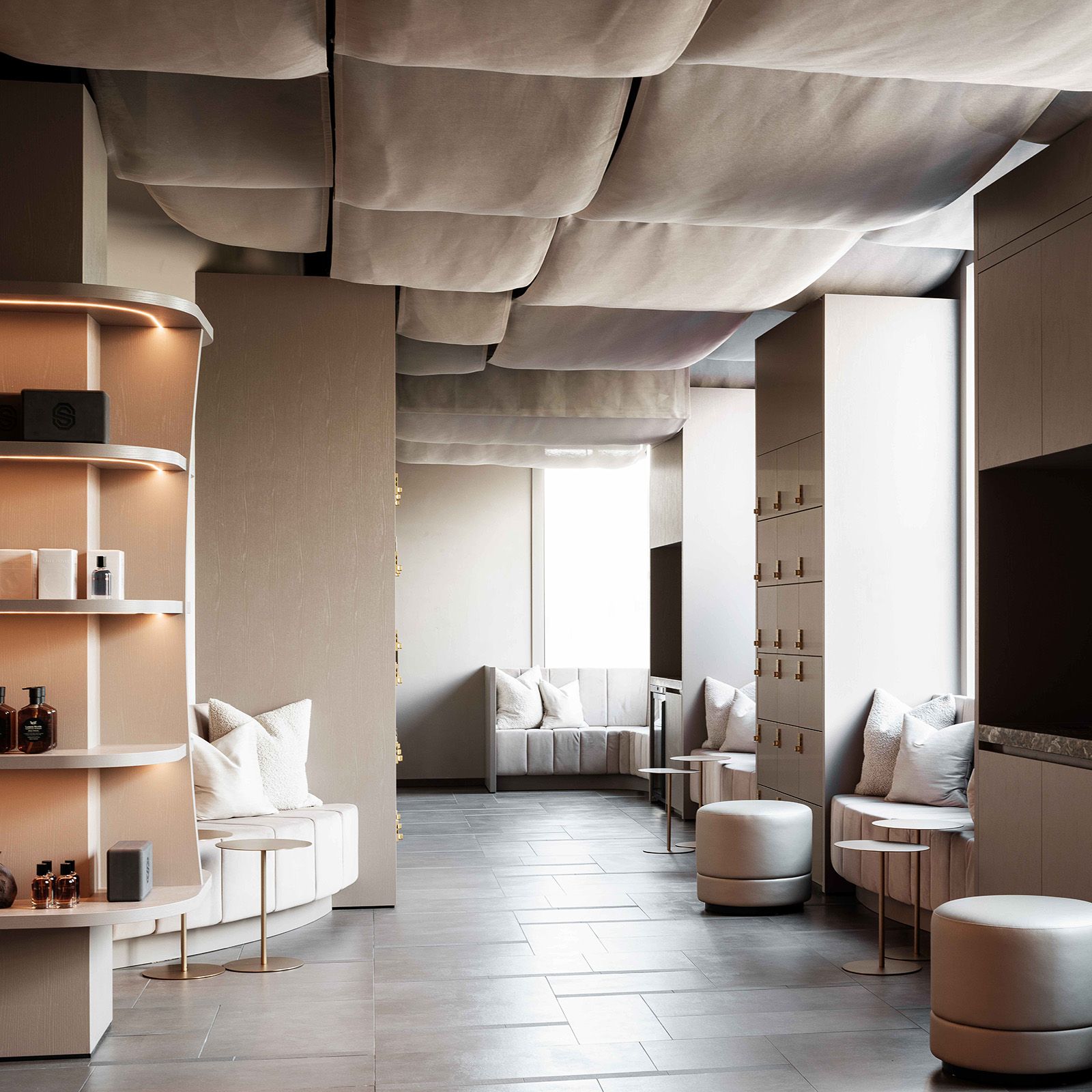 The reception and retail area of Saints and Stars features a welcoming ambiance with its sleek, modern design. The luxurious materials and thoughtful layout create an inviting space for visitors.
