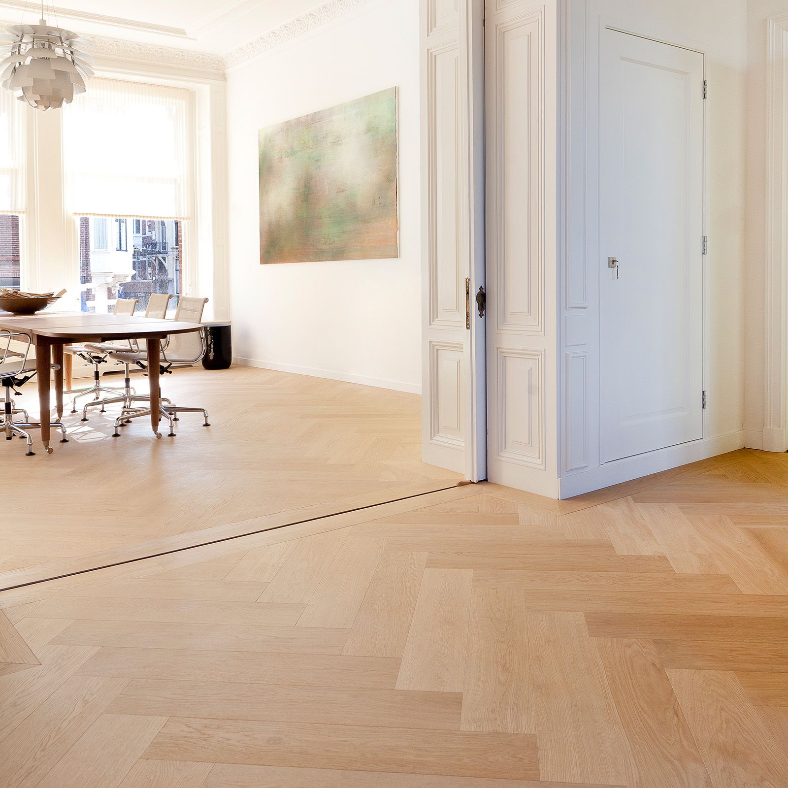 In the heart of Amsterdam, this private residence doubles as a refined home office, blending traditional elegance with modern design. The interiors emphasize clean lines and a sophisticated atmosphere, with the flooring playing a key role.