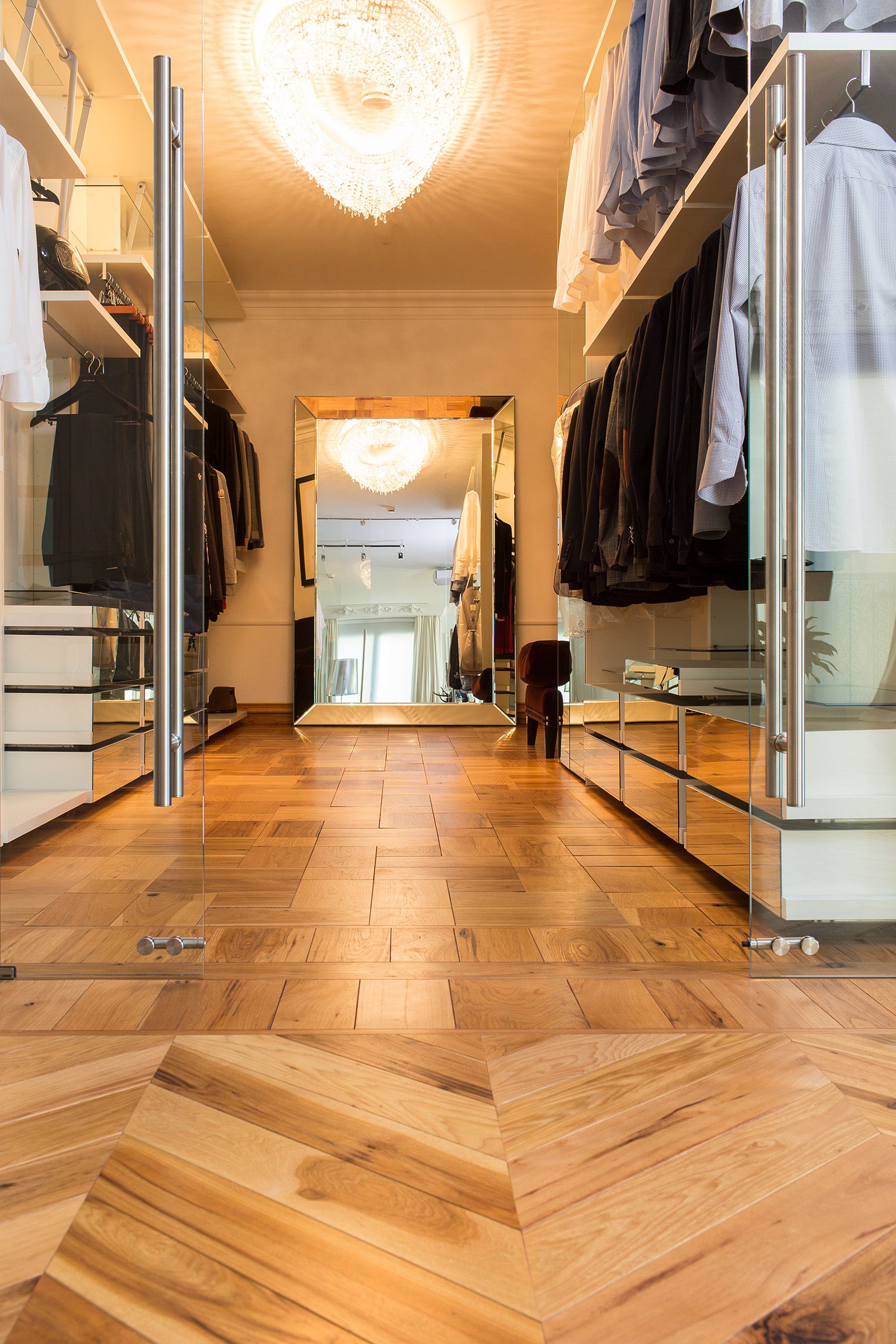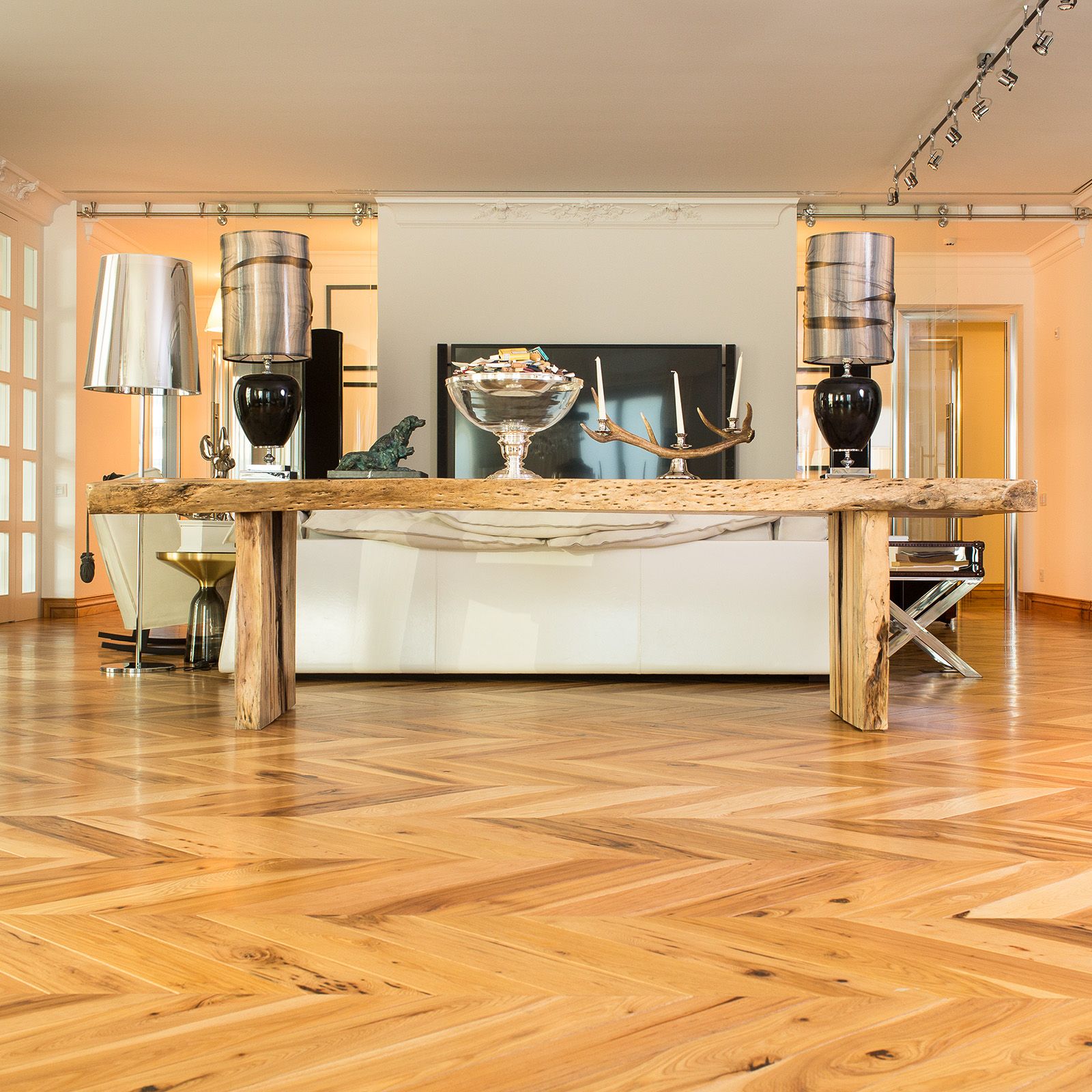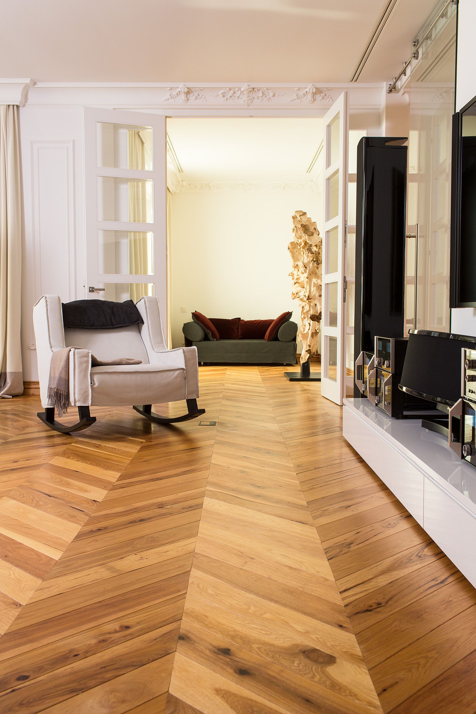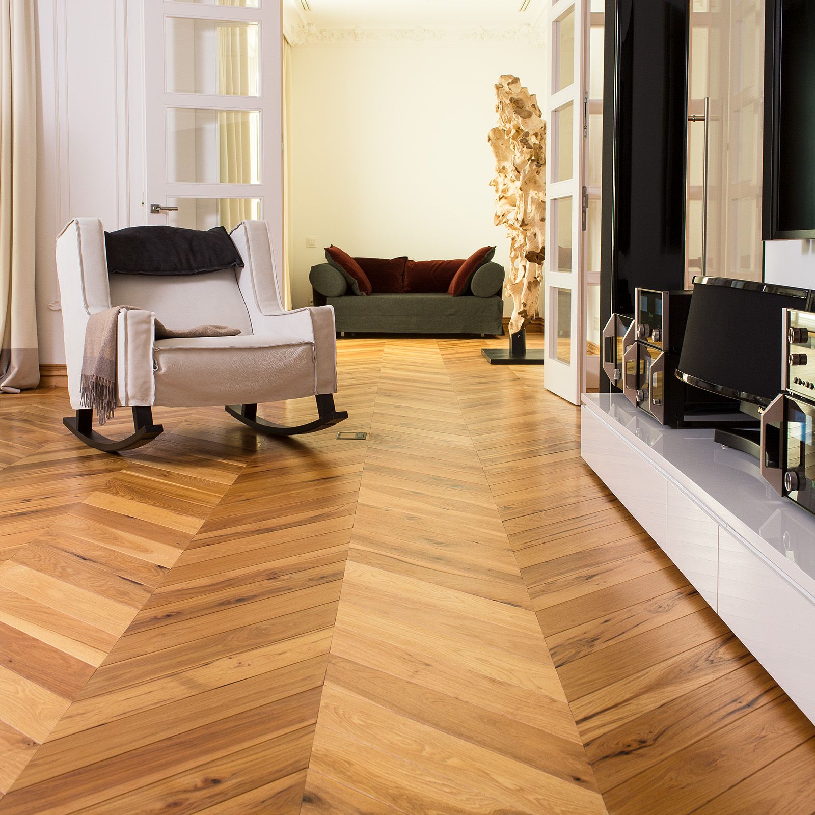 The random widths of 17-30 cm create a more textured, artisanal feel, contrasting nicely with the precision of the chevron pattern. The hand-scraped technique adds rustic charm, grounding the interior's opulence in natural beauty.