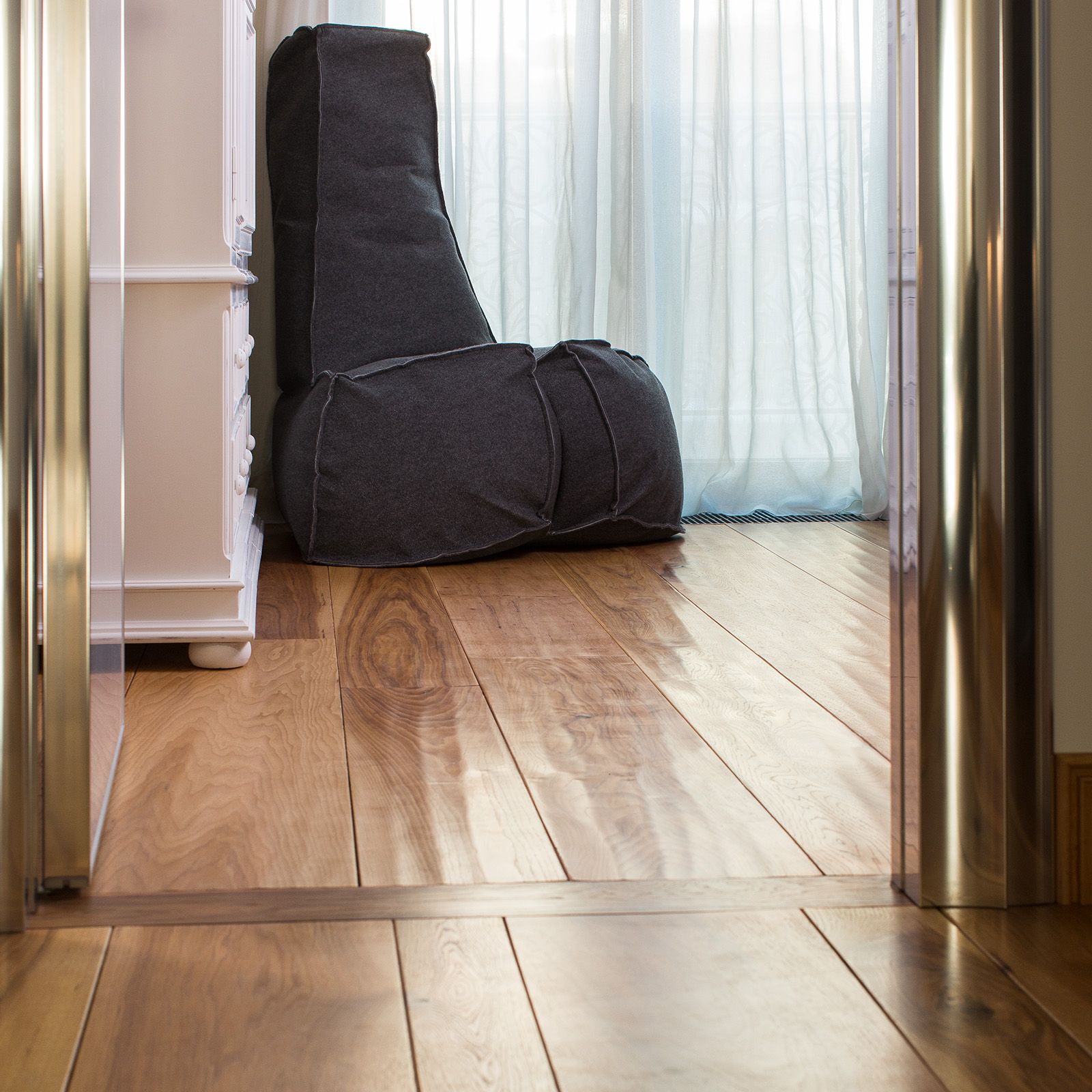 In other parts of the home, including transitional spaces, the flooring shifts to handscraped Solid American Walnut, also finished with Satin Poly.