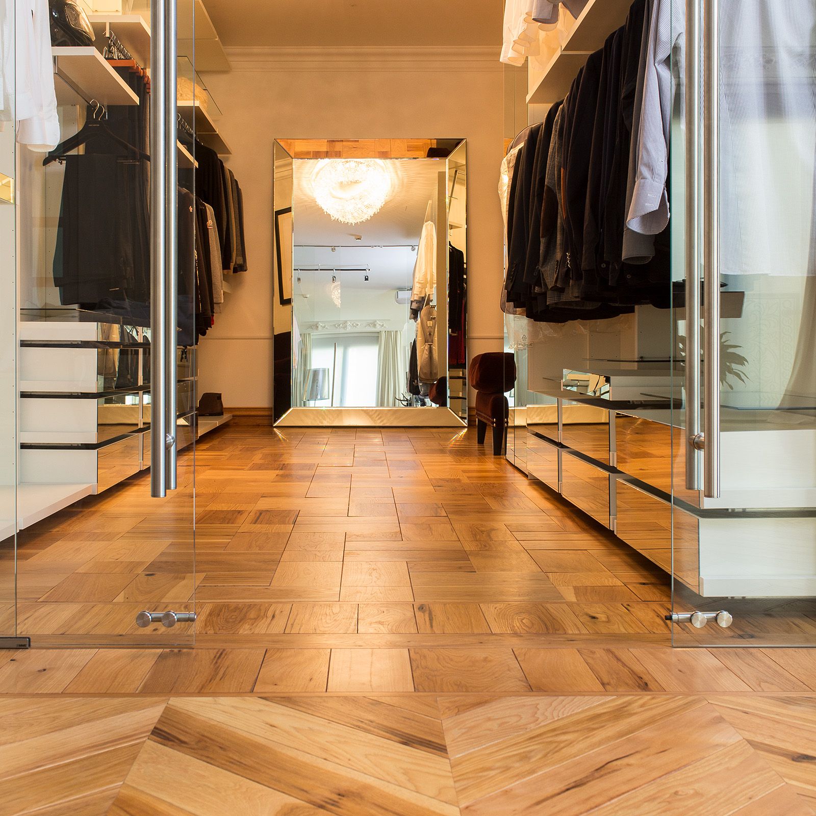 Floors:Hickory Country, finished with Satin Poly, in chevron and bespoke parquet patterns. Handscraped Solid American Walnut, finished with Satin Poly, in random widths of 17-30 cm.