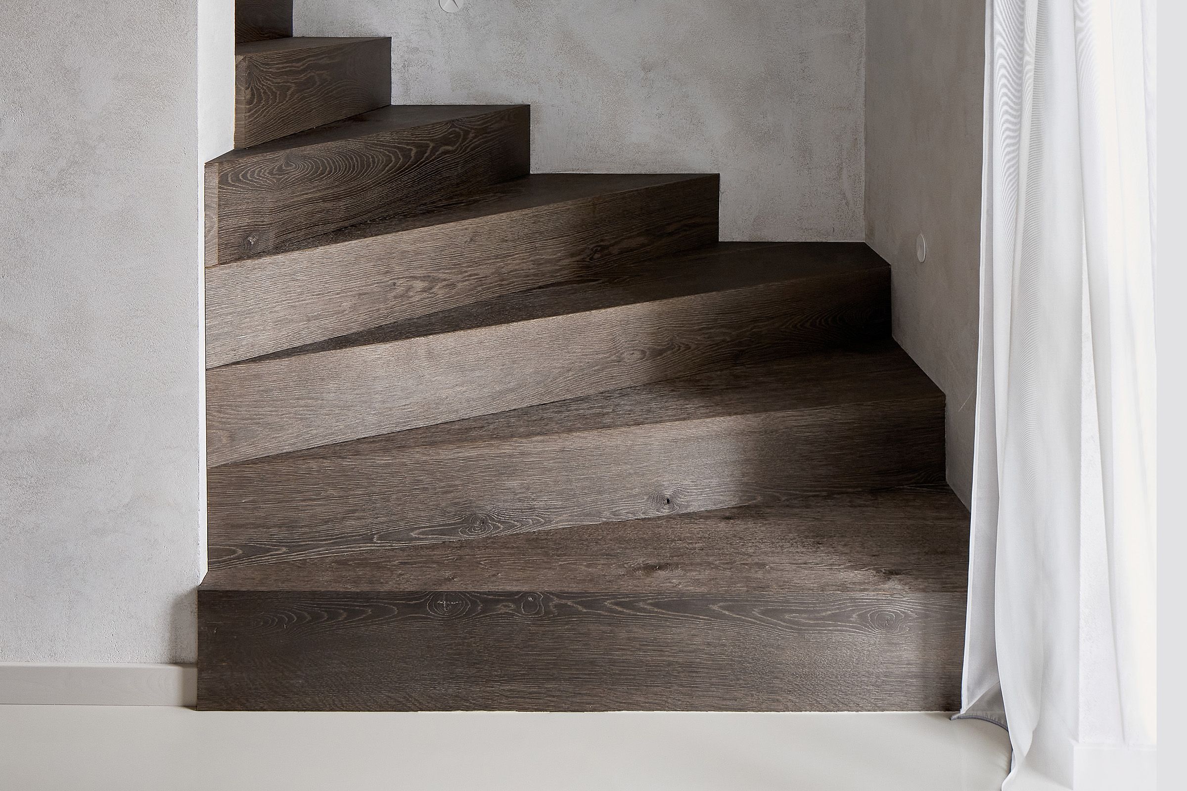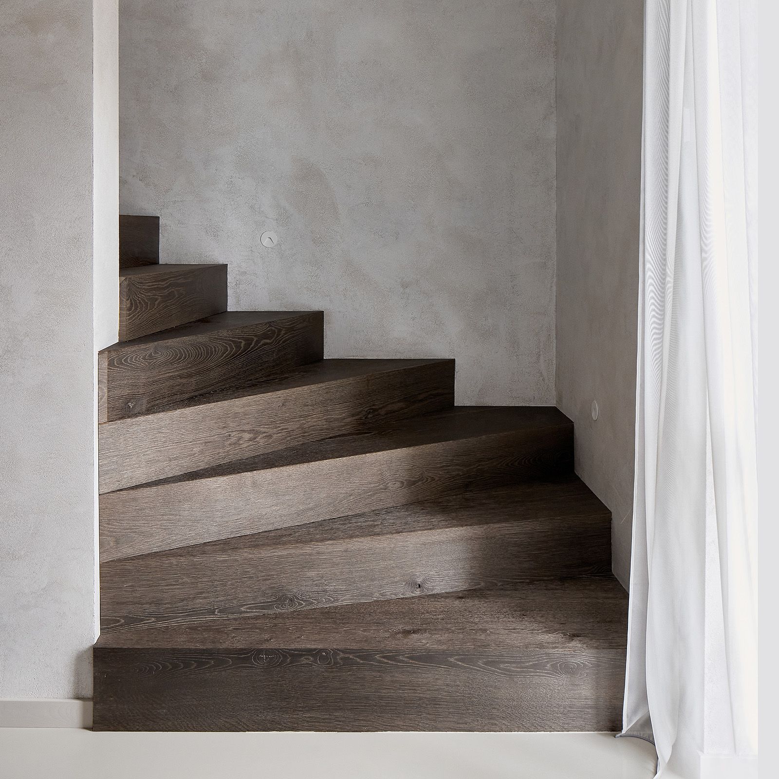 The stairs are also finished in the same floorboards, with each tread and riser fully wrapped to continue the same tone and texture across levels. This gives the transition between floors a natural, built-in feel, without visual breaks.
