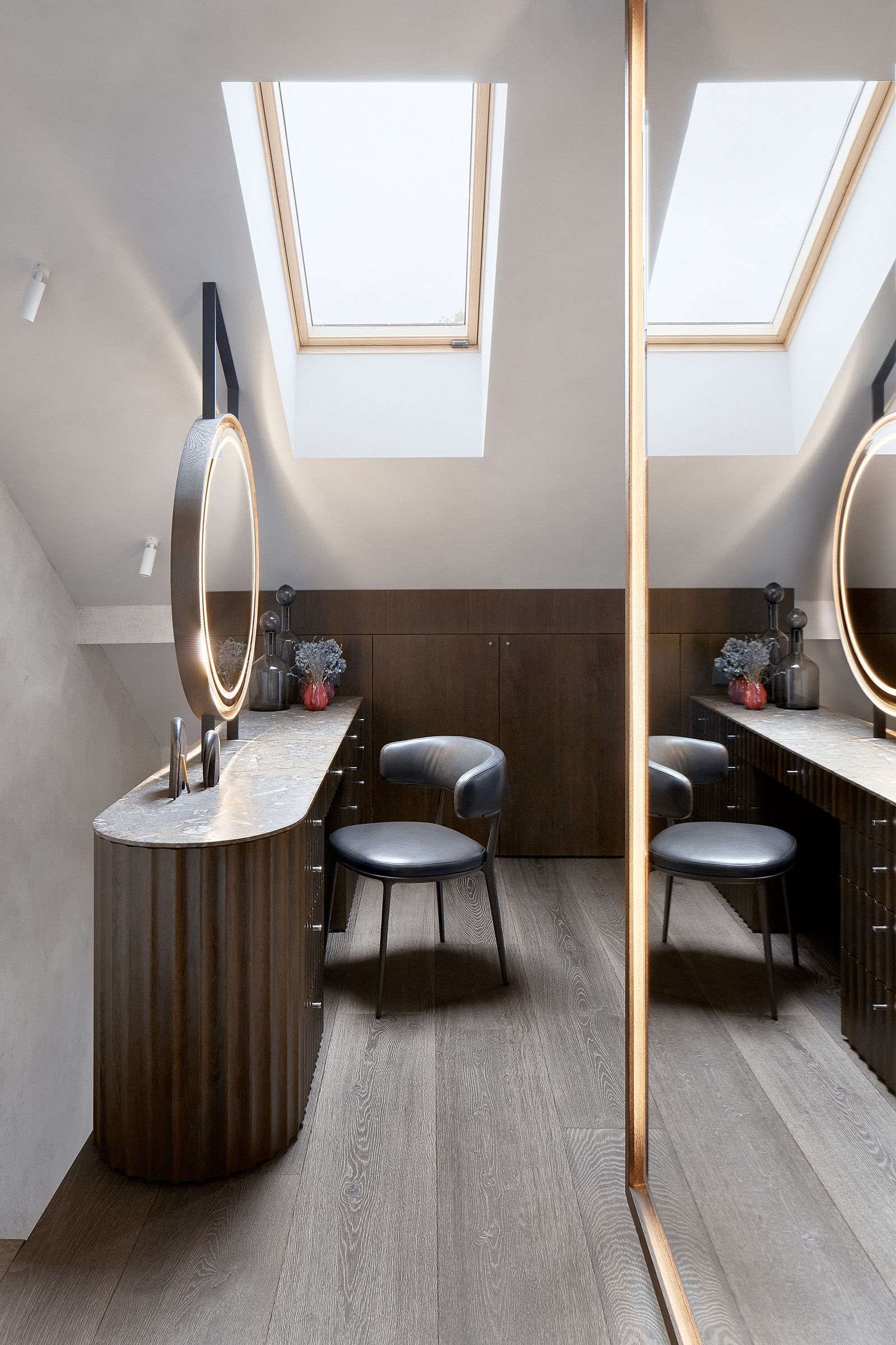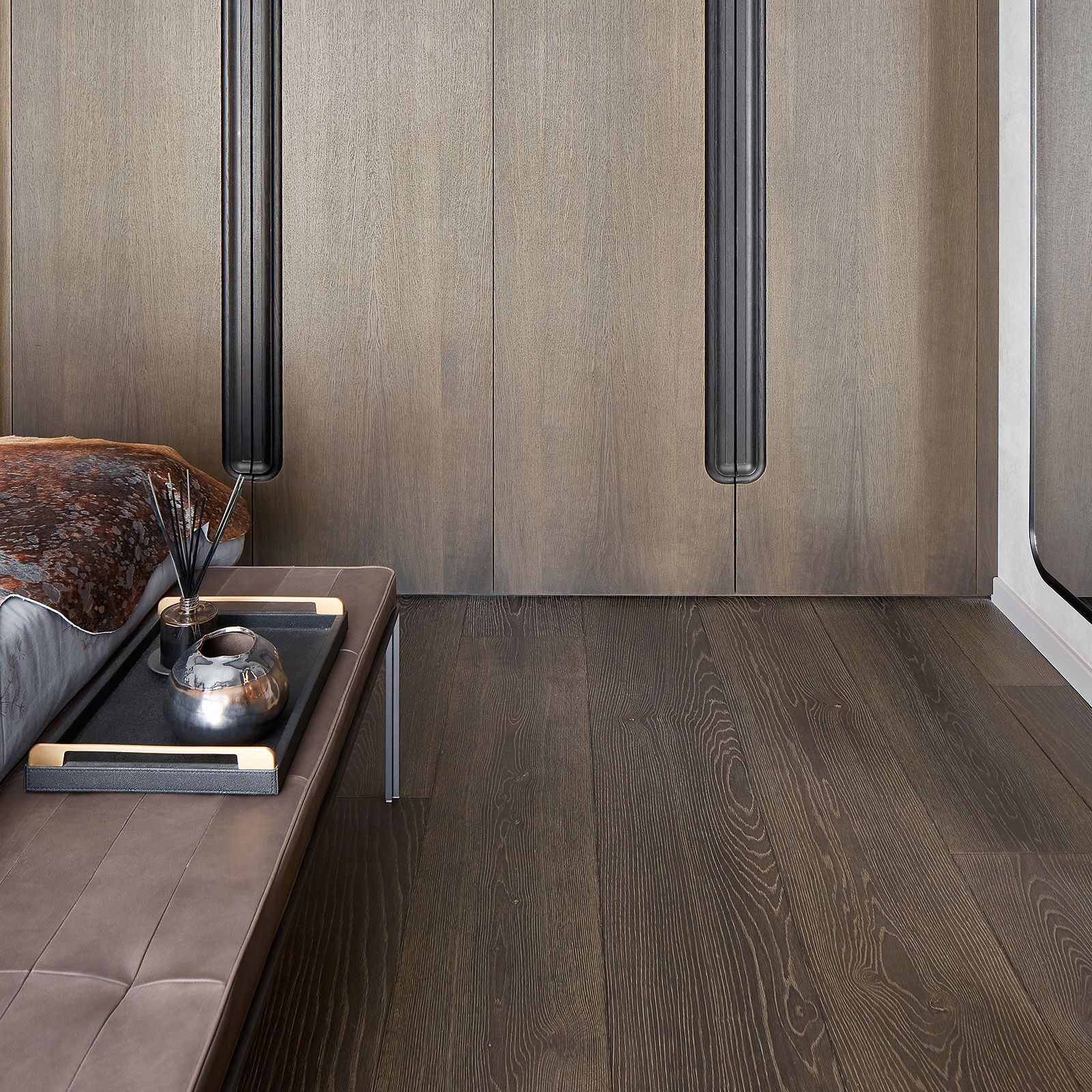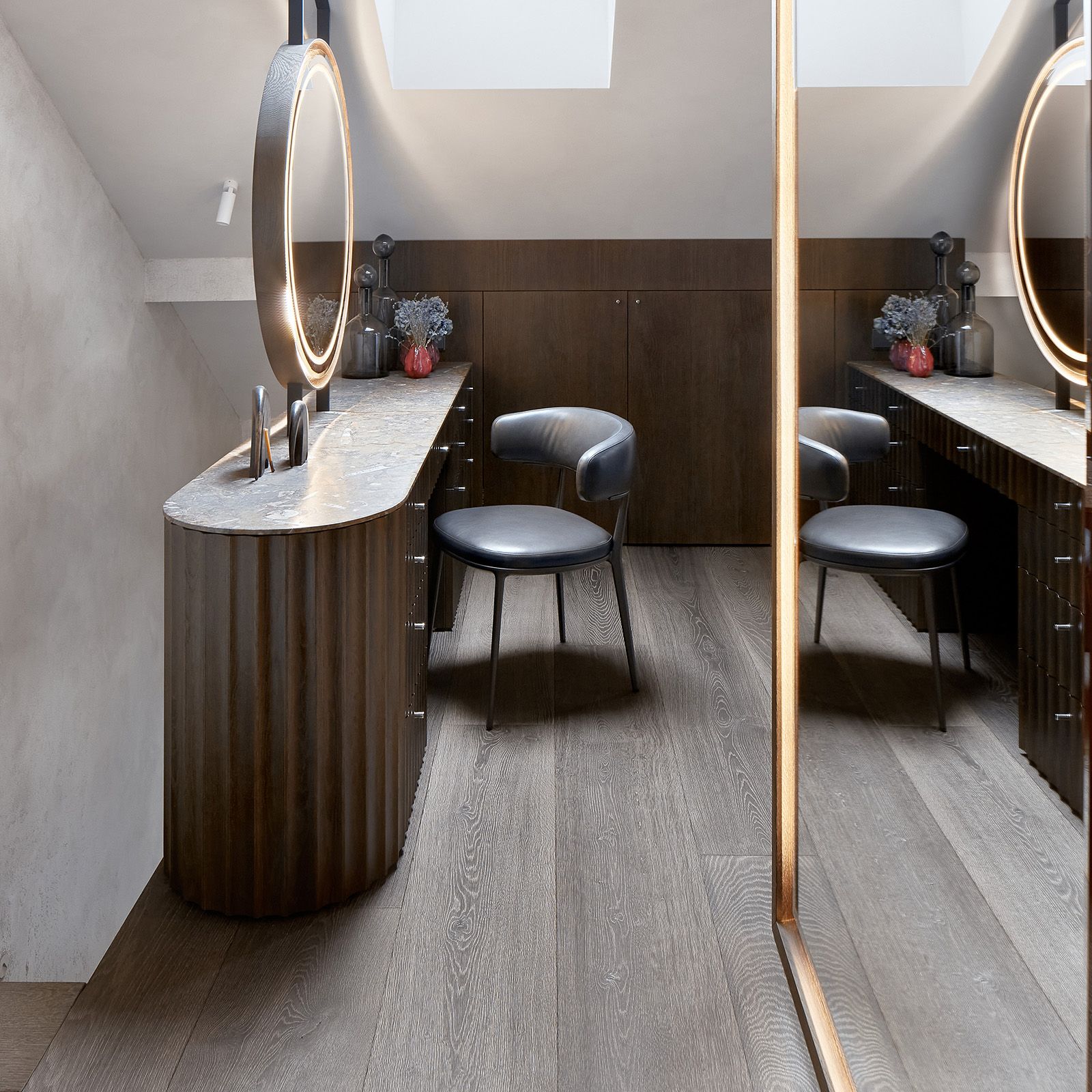 In the bedroom, the flooring works in harmony with the custom cabinetry, enhancing the tone-on-tone palette and adding structure underfoot. The wide 30 cm format helps anchor the space and highlight the natural proportions of the room. The grain adds quiet movement across the long planks, without overpowering the space.