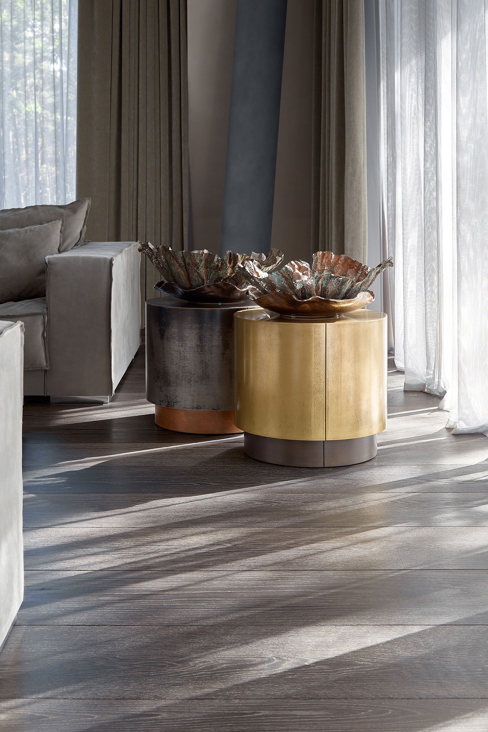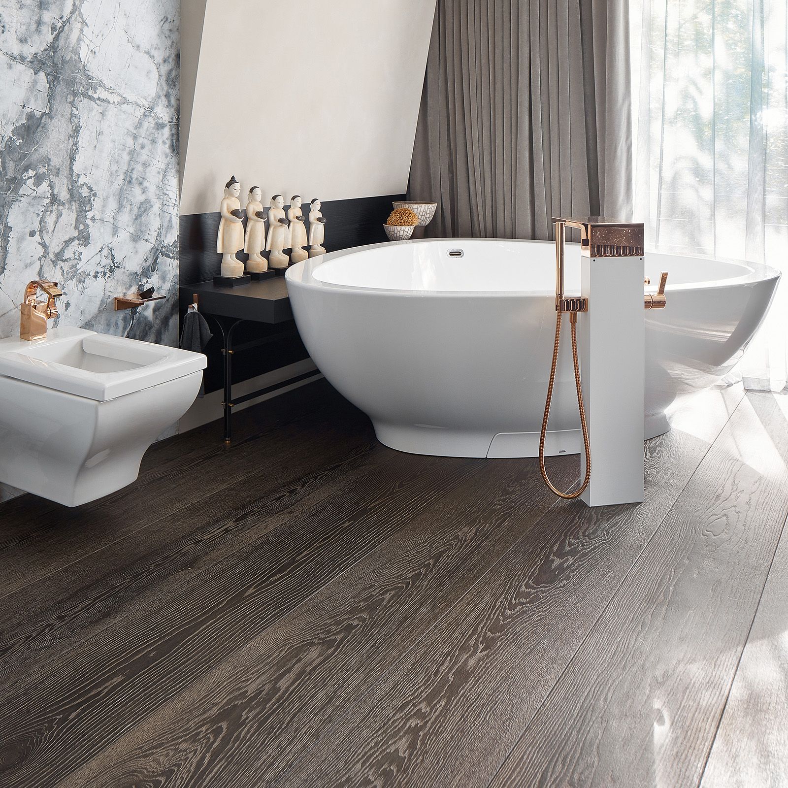 In this designed residence in Lithuania, interior architect Darius Budrys created a calm and harmonious atmosphere using natural materials and soft light. Our wide Continental Oak Select planks, finished in Megeve Lava Hardwax, bring a quiet richness to the space with their deep, smoky tone.