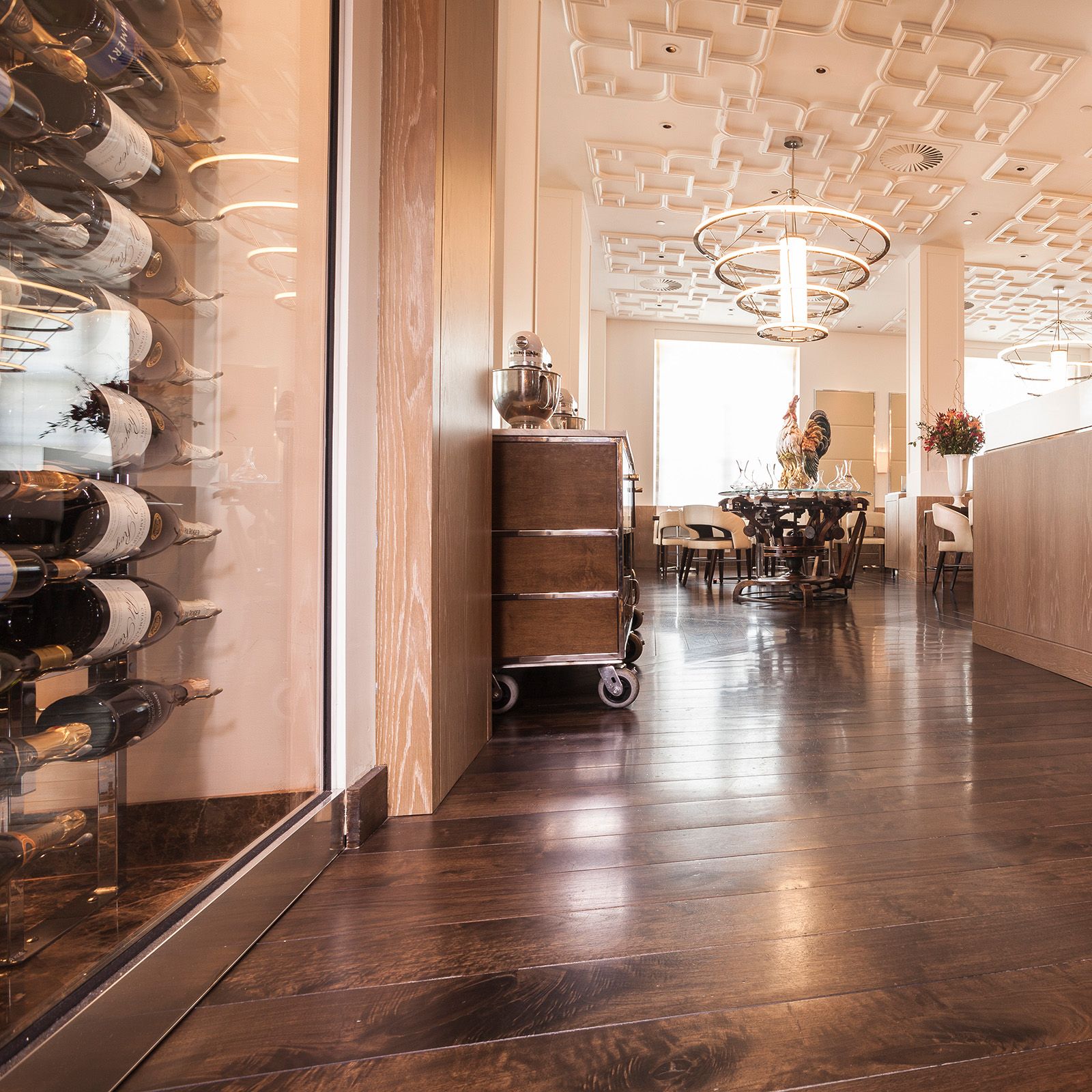 The Espresso Brown Satin Poly finish imparts a warm, luxurious sheen, creating a welcoming ambiance. The 10-inch fixed width pattern adds a touch of bespoke craftsmanship, aligning with the restaurant's reputation for culinary excellence.