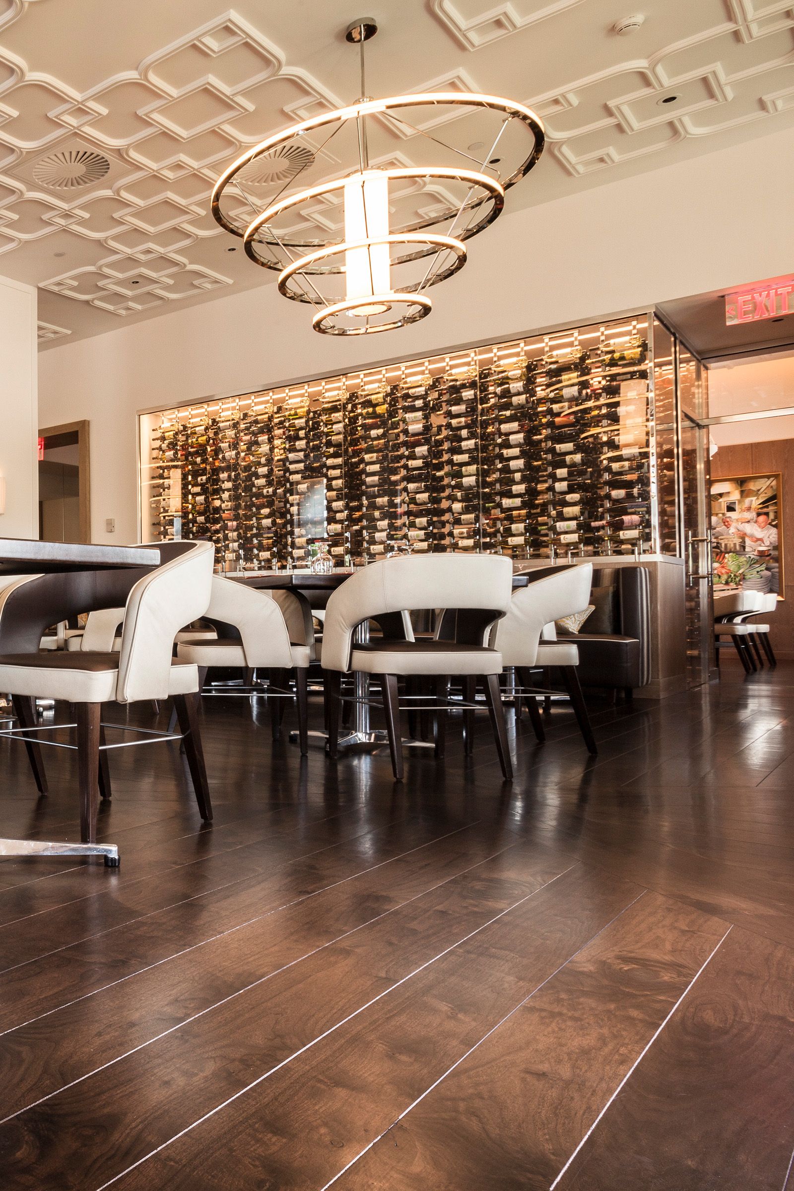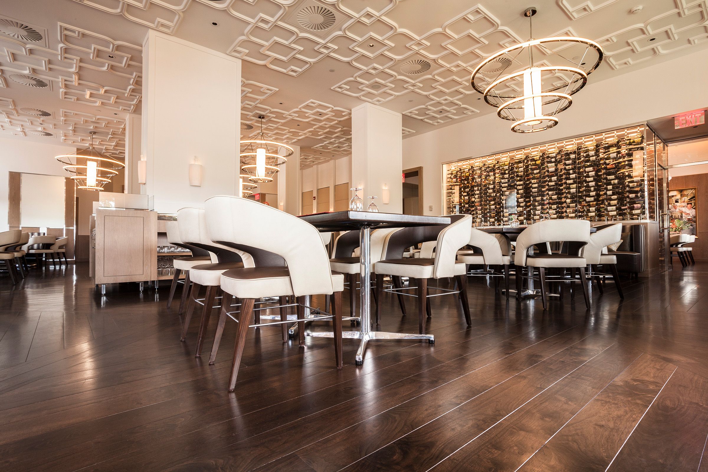 The Bocuse Restaurant at the Culinary Institute of America blends traditional elegance with modern sophistication, perfectly complemented by the rich tones of Solid American Walnut flooring.