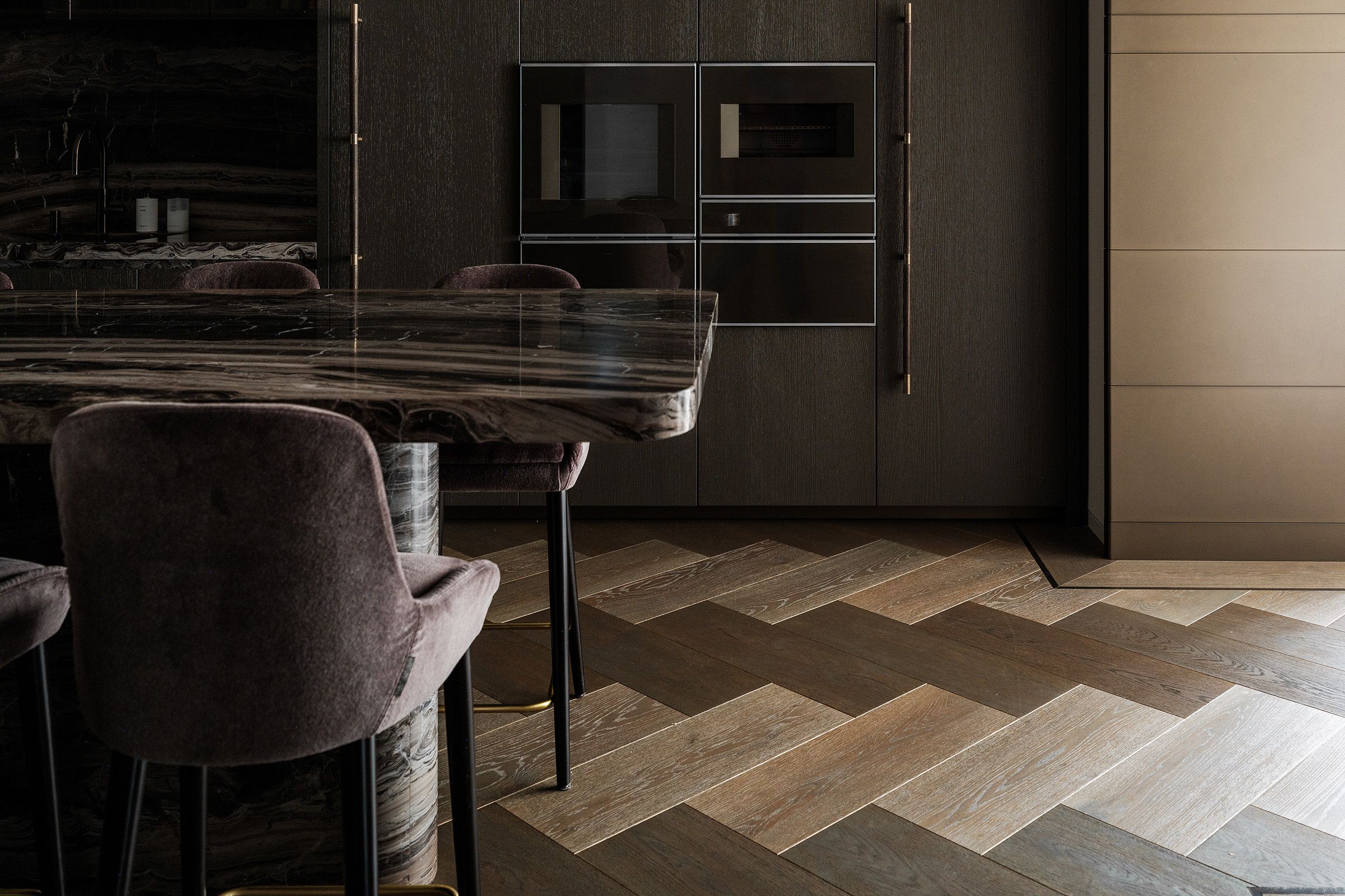 Our Continental Oak, Fusion Select with a bespoke finish, runs throughout the home. The 26 × 78 cm wide herringbone is paired with aged bronze metal inlays, introducing a subtle rhythm that connects each space while responding gently to light and movement.