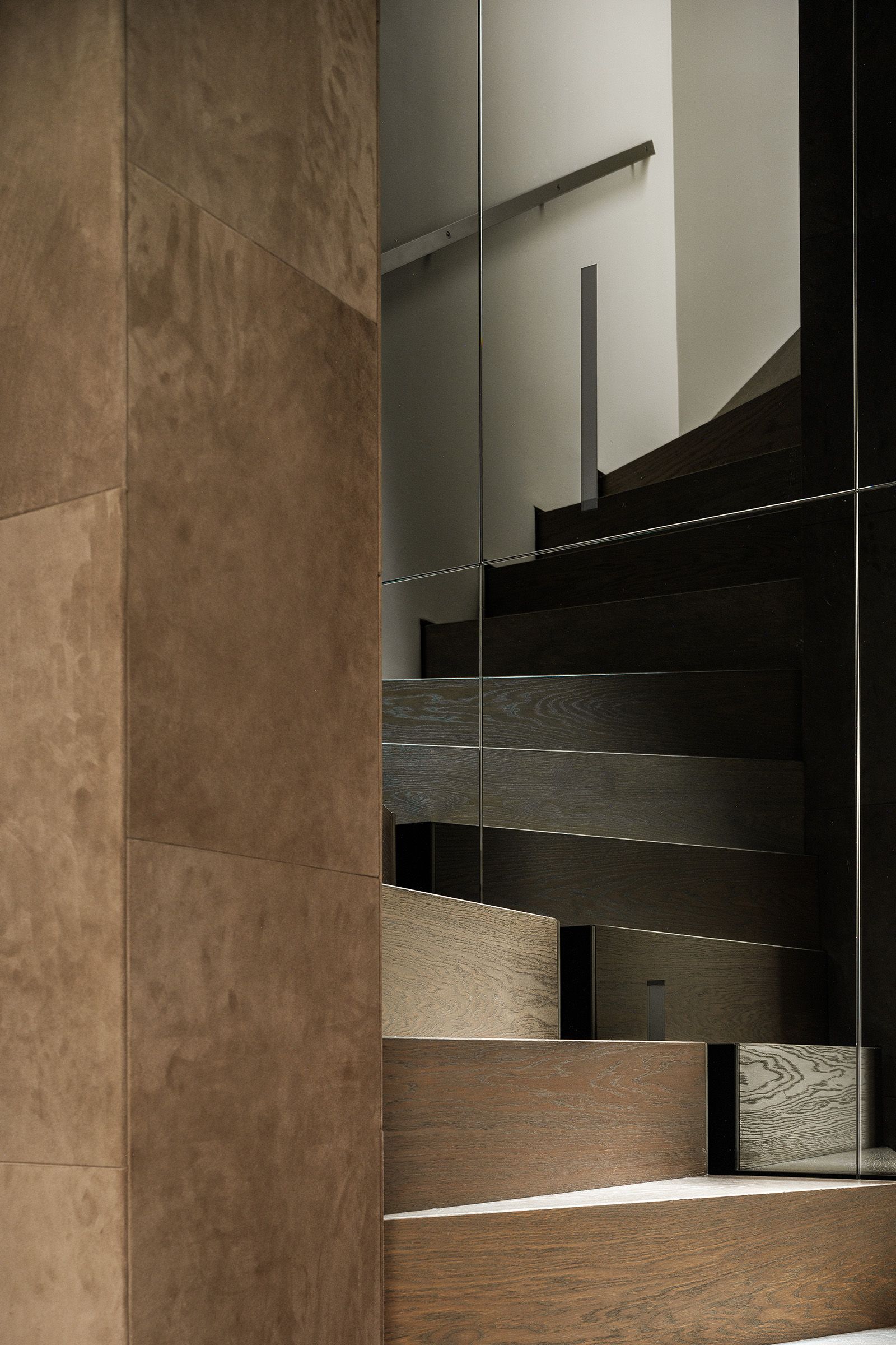 A composition of dimension, reflection, structure and softness. The wooden floor and suede walls work together to create a smooth and balanced transition between levels.