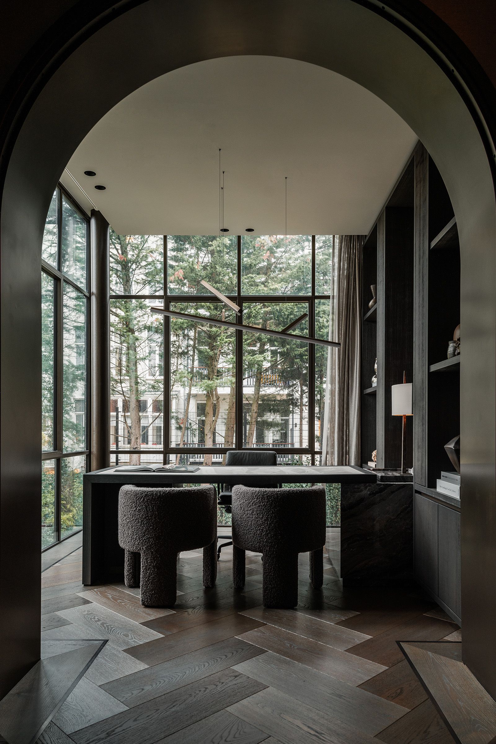 A home office with a “New York state of mind” set in Amsterdam. Views over Vondelpark and light entering from multiple angles bring together height, warmth and a sense of understated elegance.