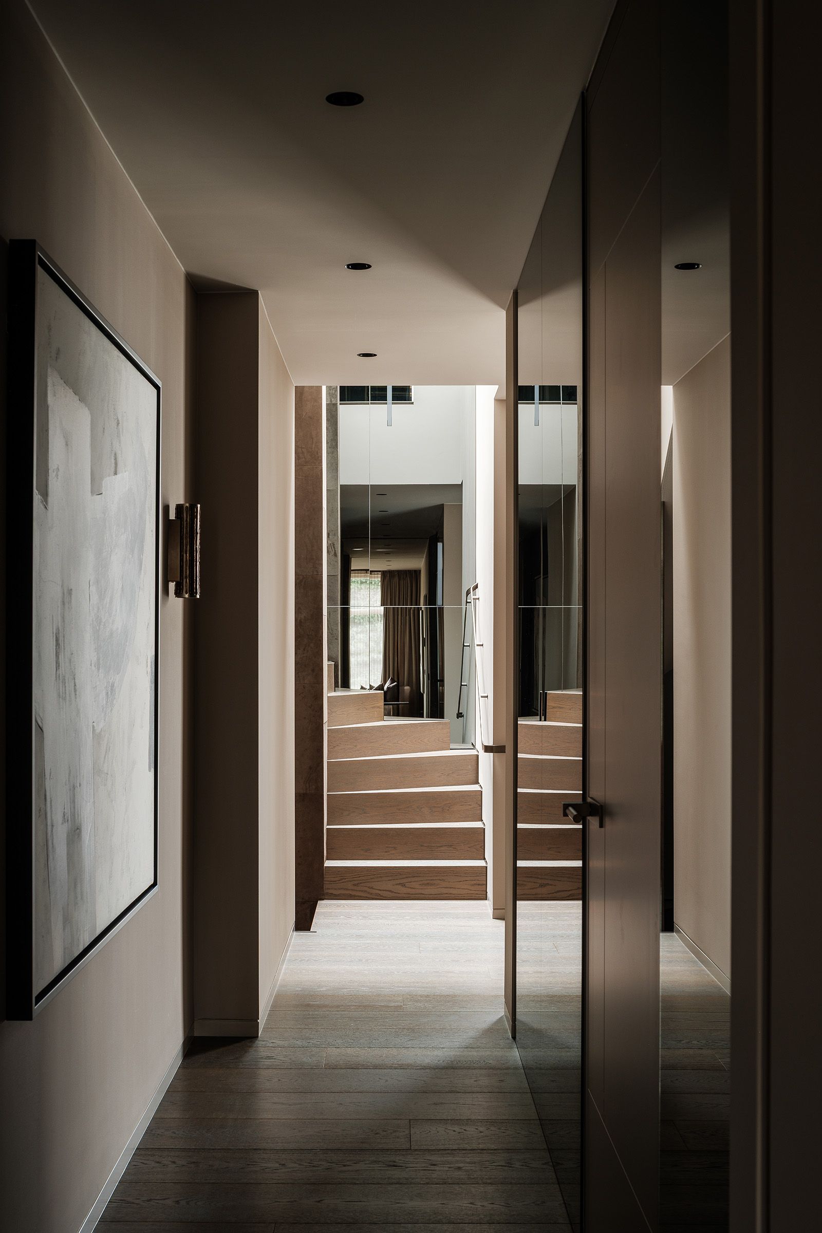 The entrance towards the master suite is defined by alignment and reflection. The wide plank wooden floor follows the structure of the staircase, complemented by a back wall mirror extending across multiple levels. The Pearly floor lightens the space with subtle clarity.