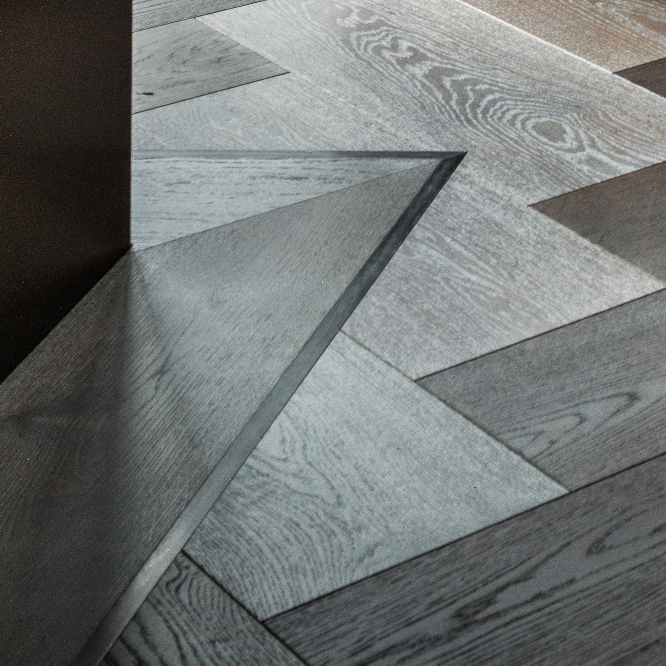 Floor:Continental Oak | Fusion Select in a bespoke finish | 26×78 cm wide herringbone with aged bronze metal inlays.