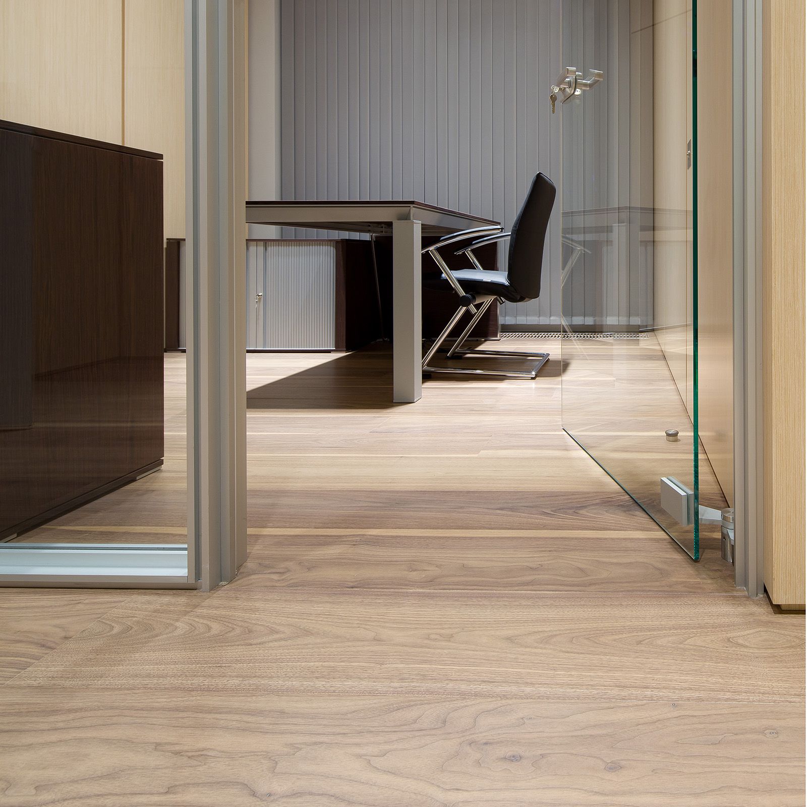 The office flooring is crafted from Engineered American Walnut Fusion Select Grade, known for its rich tones and fine grain.
