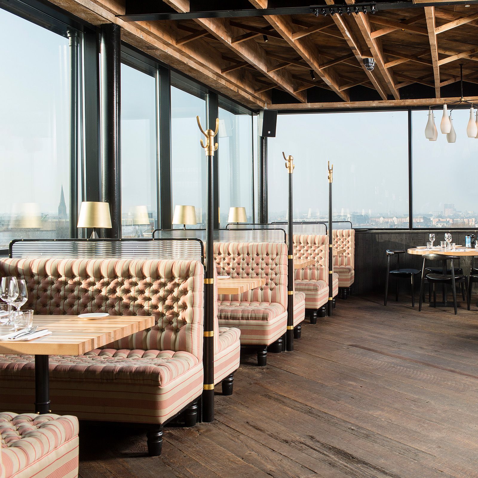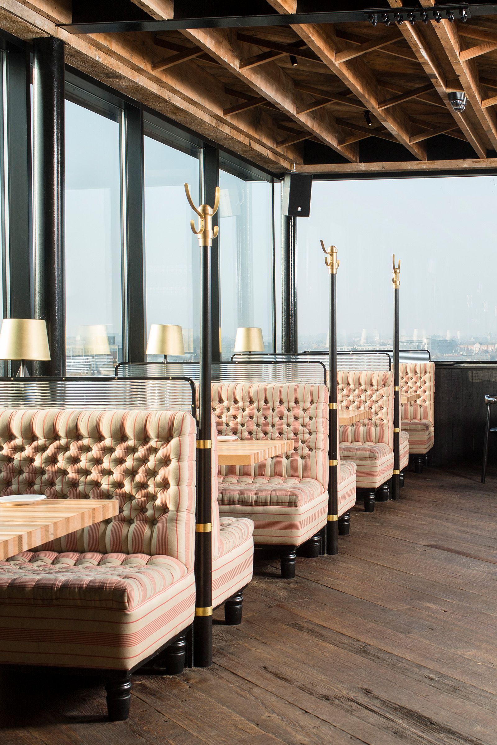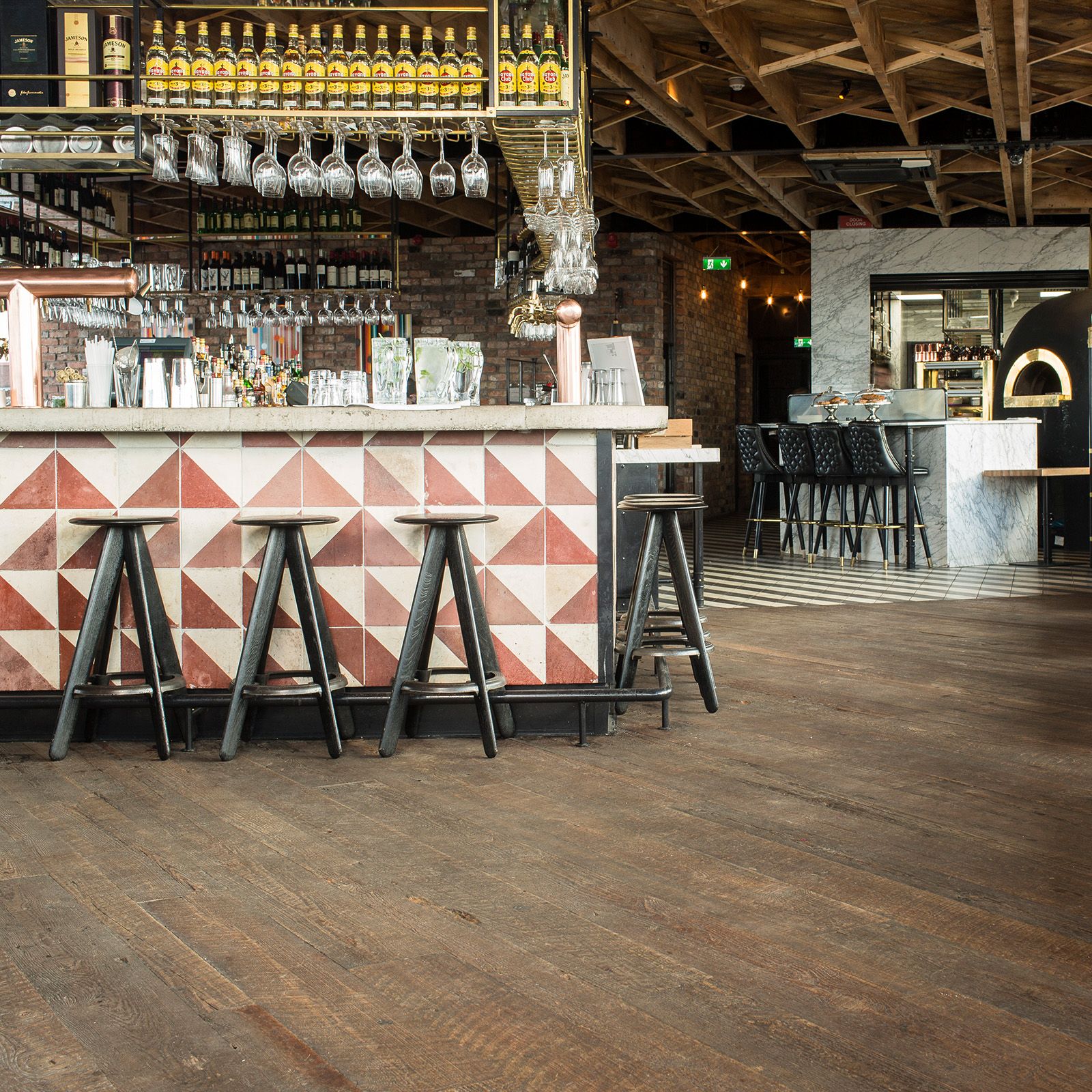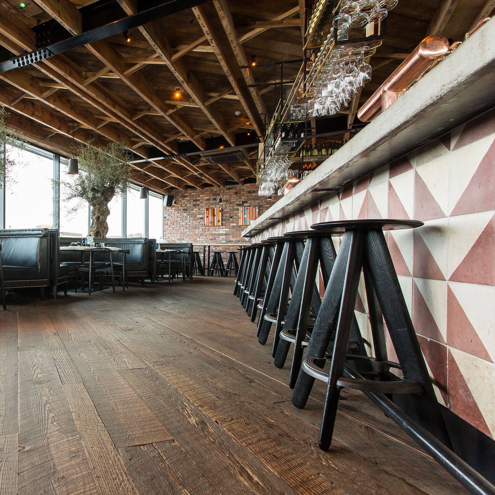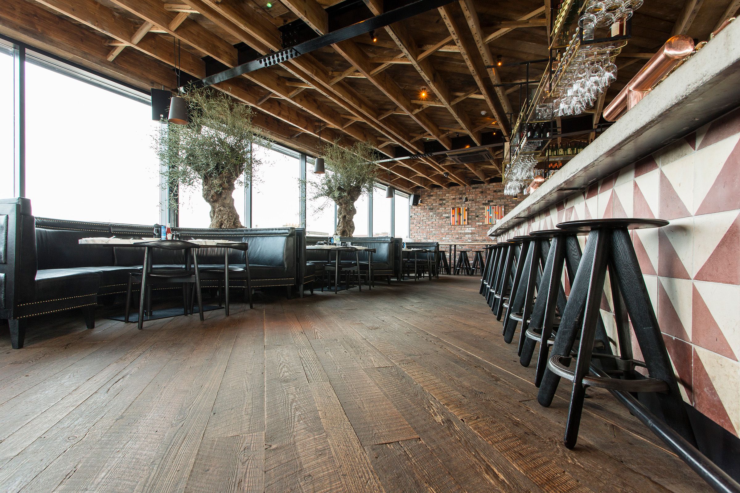 The rooftop bar could just as well be in Brooklyn, and sets the trend. Not surprisingly we were asked, we had to bring original beam-skin cuts to produce an authentic all-American floor that only gain more character over time.