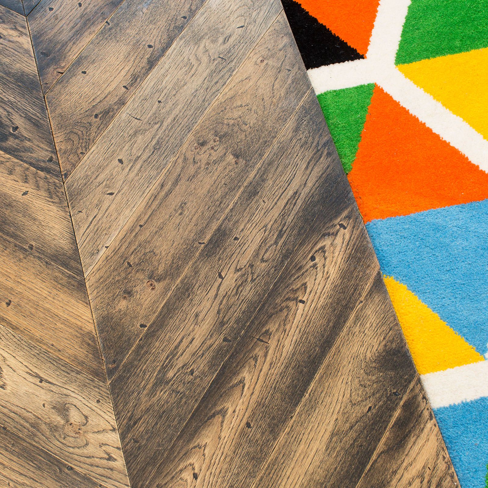 Guest Rooms:Continental Oak Country, Bespoke Chevron, Distressed, Custom Hardwax Finish 12x60 cm.